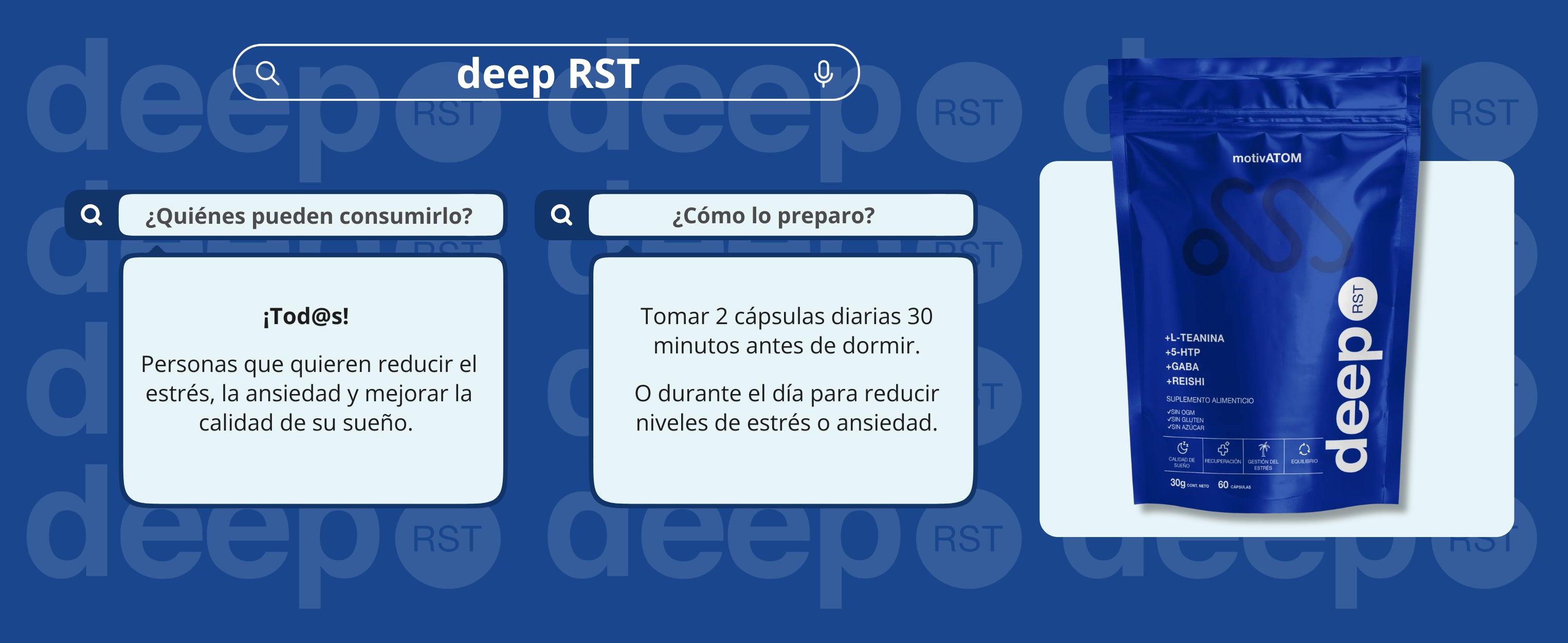 El deep RST es una fórmula diseñada con adaptógenos para acompañarte en tu rutina nocturna, ayudando a crear un ambiente de calma y equilibrio antes de dormir.